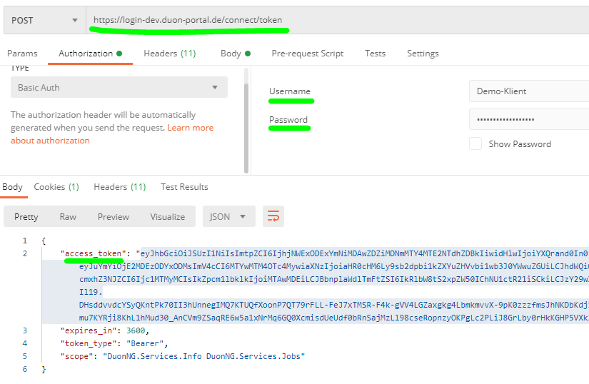 Zur Authentifizierung werden Zugriffstokens verwendet (JWT). Werden API-Methoden aufgerufen, ohne ein solches Token zu übergeben, oder wenn die zeitliche Gültigkeit des Tokens (eine Stunde nach Ausstellung) abgelaufen ist, wird implizit der Demo-Klient als Aufrufer angenommen.